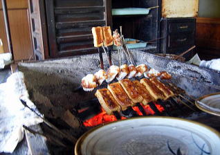 囲炉裏端で焼かれる餅、厚揚げ豆腐、こんにゃく、身欠き鰊の味が懐かしく、
